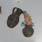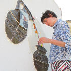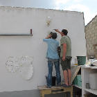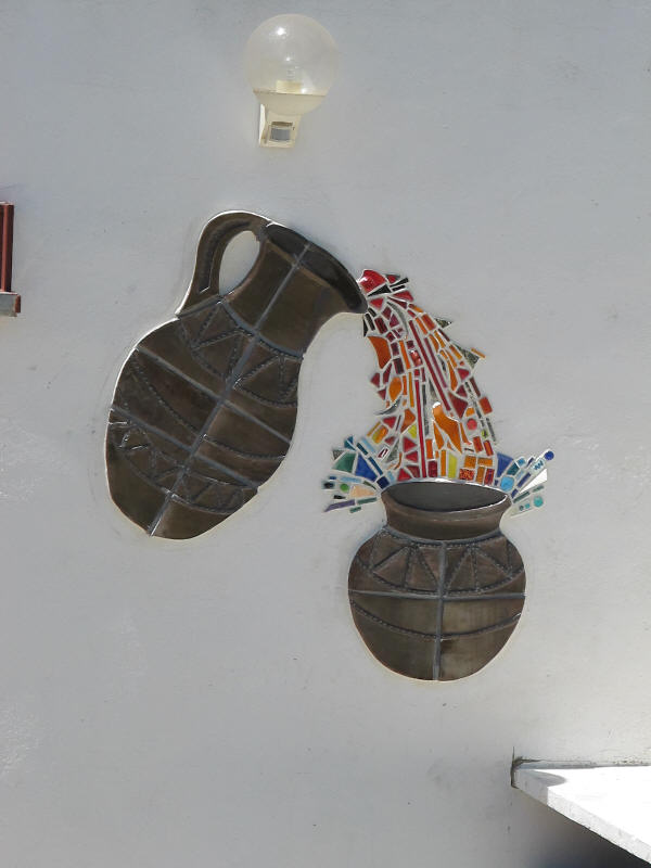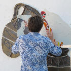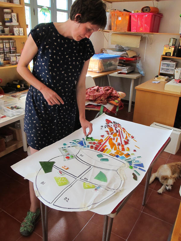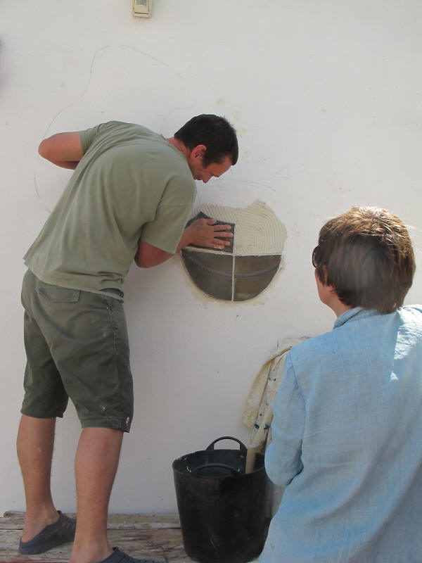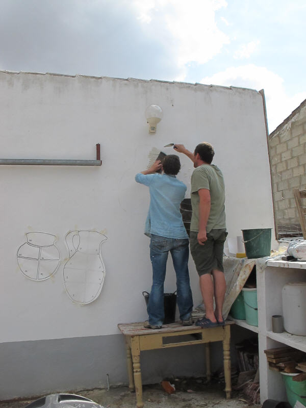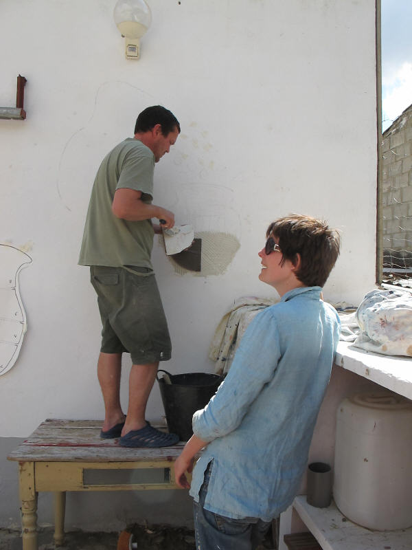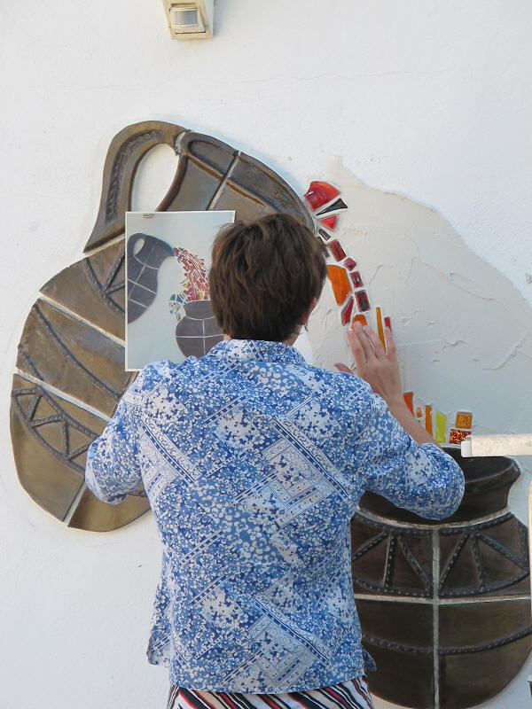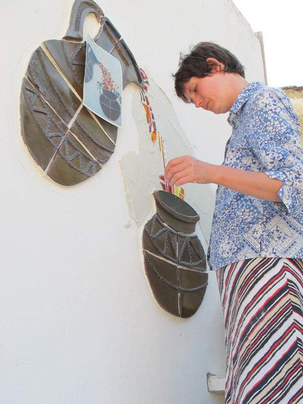 A very long planned mural at the entrance has finally happened. A mixture of ceramics and glass to give a flavour of what we do here assembled and finished by Olly and Alison who spent many weeks with us working, helping, advising and generally being a wonderful part of our team (see below). See the series of pictures below……..>
