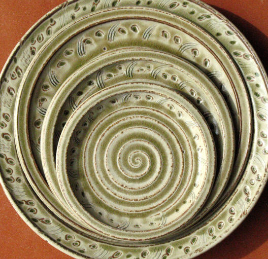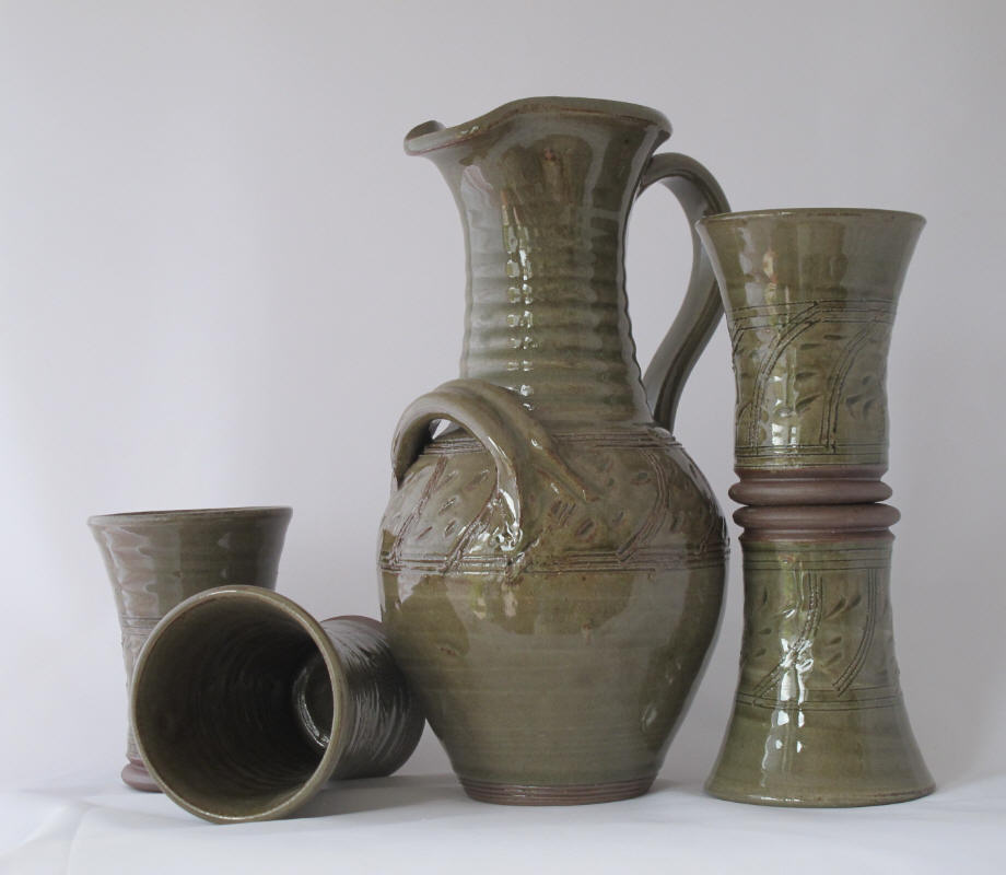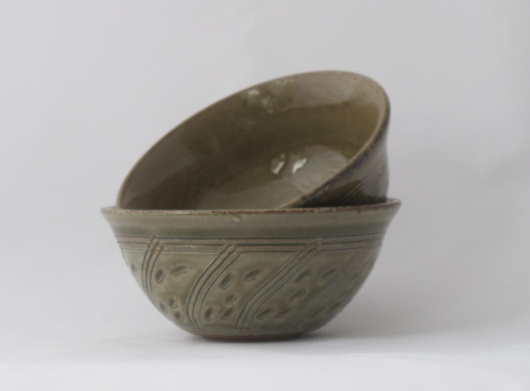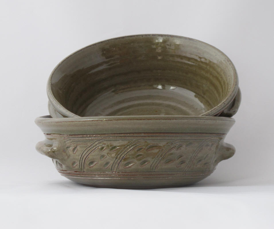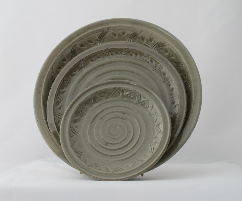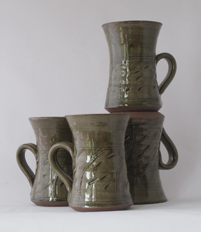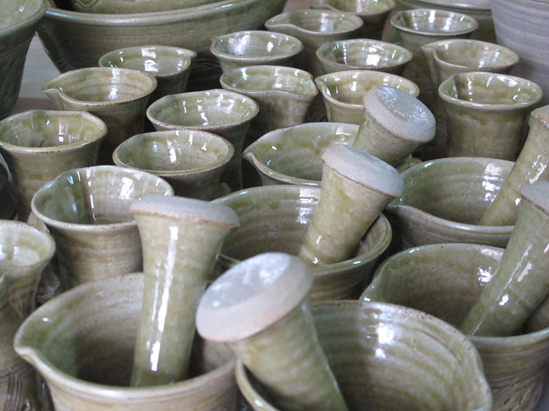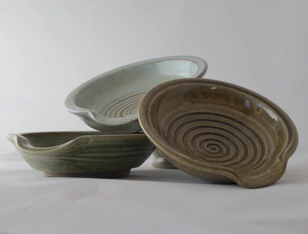 We make a range of hand-thrown tableware in high temperature stoneware clay with a simple wood ash glaze which gives a quiet green glaze, the tones being influenced by the different types of wood used for the ash, now predominantly olive and eucalyptus.