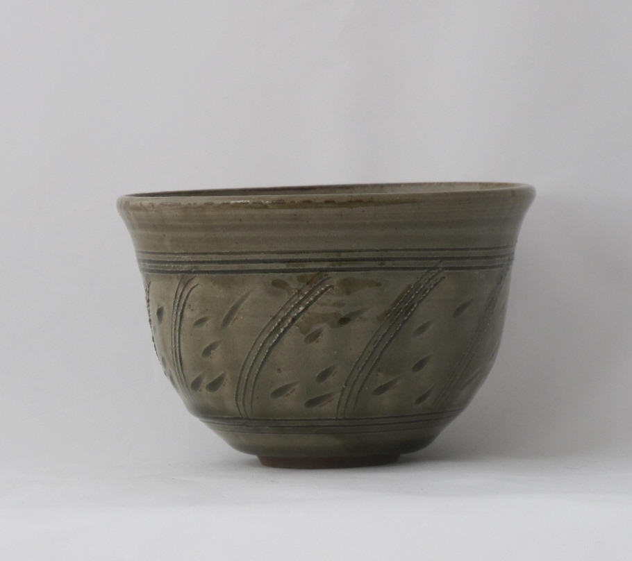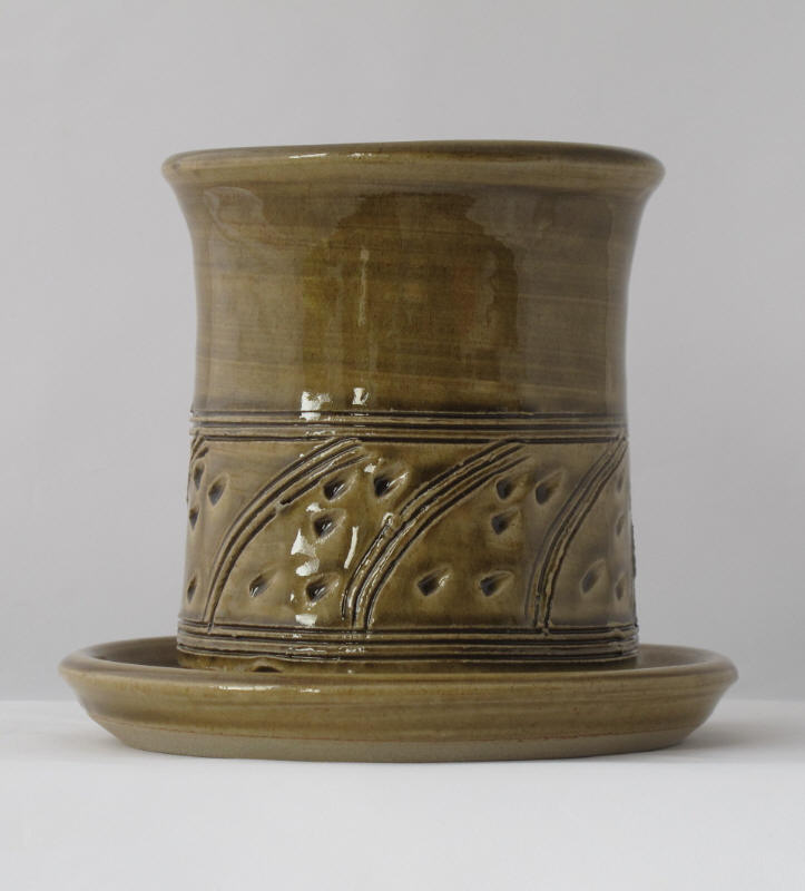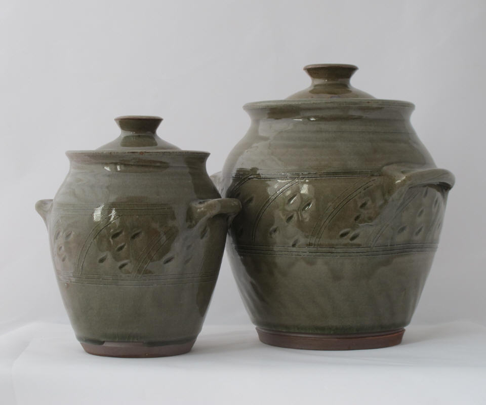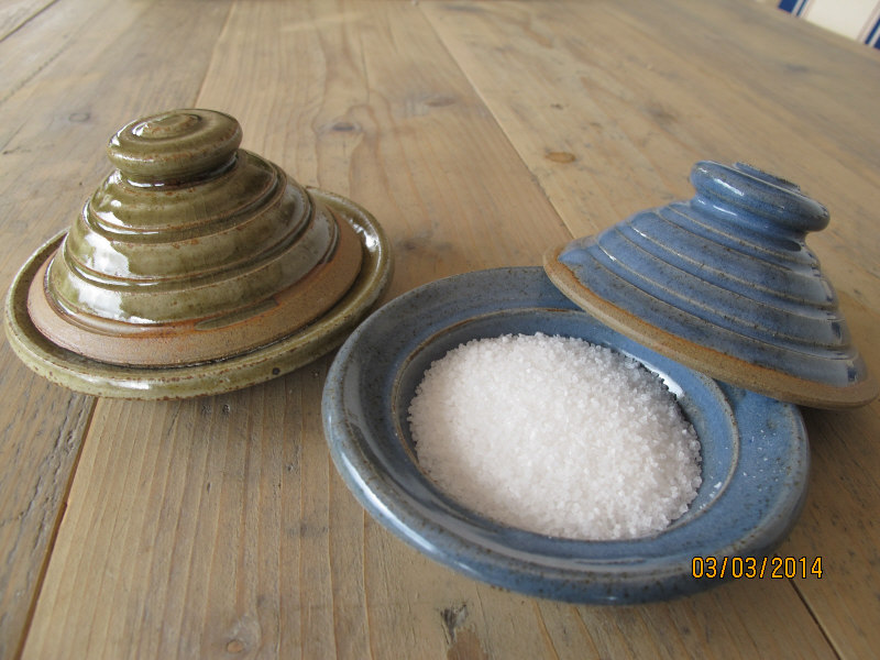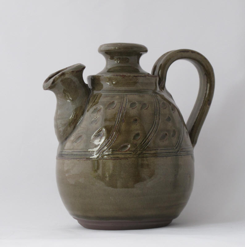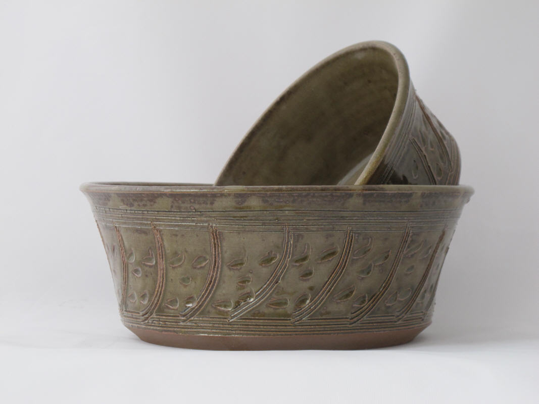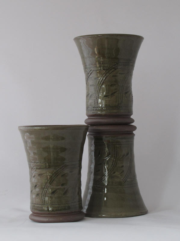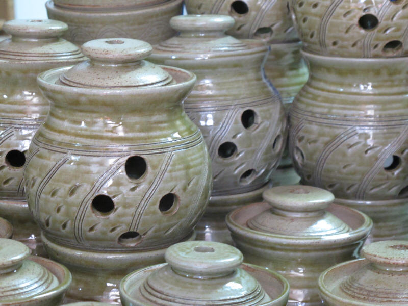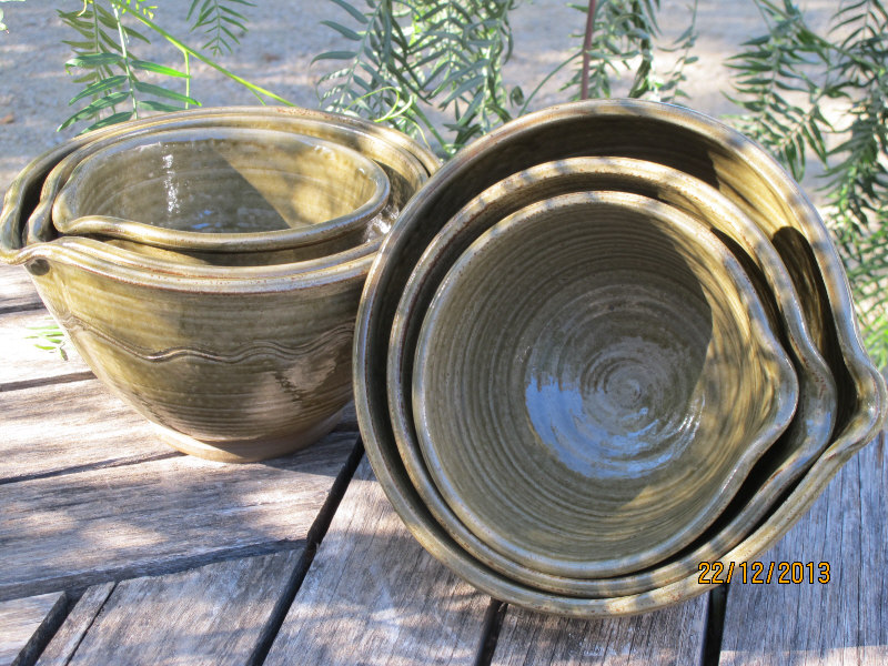 We make a range of hand-thrown tableware in high temperature stoneware clay with a simple wood ash glaze which gives a quiet green glaze, the tones being influenced by the different types of wood used for the ash, now predominantly olive and eucalyptus.